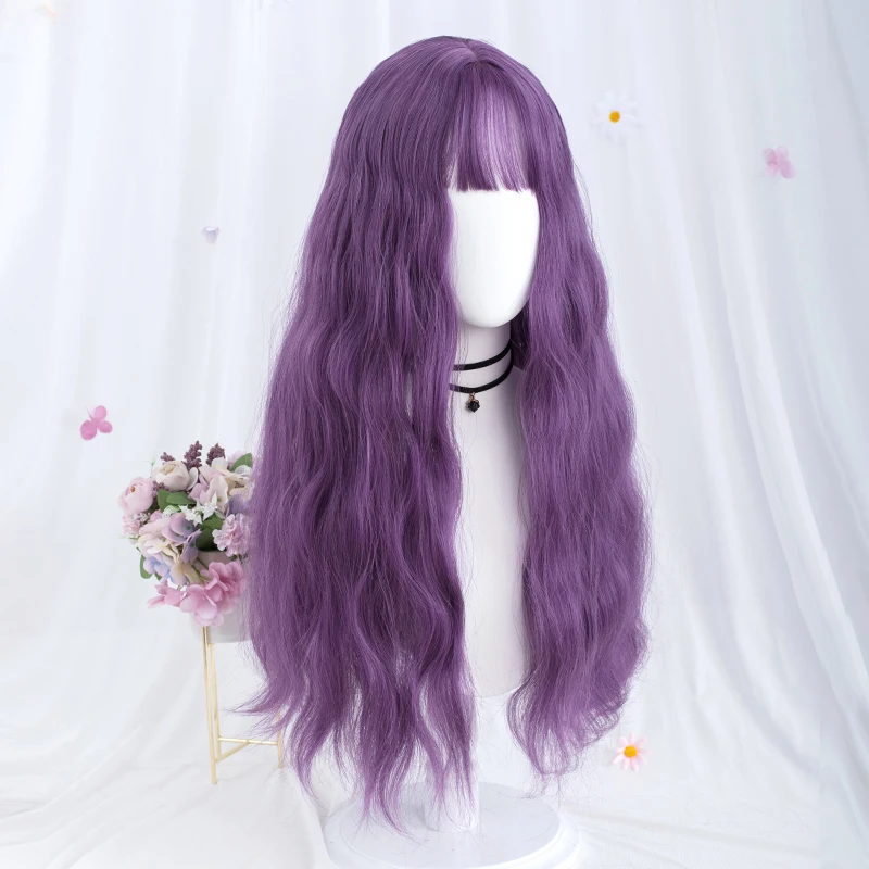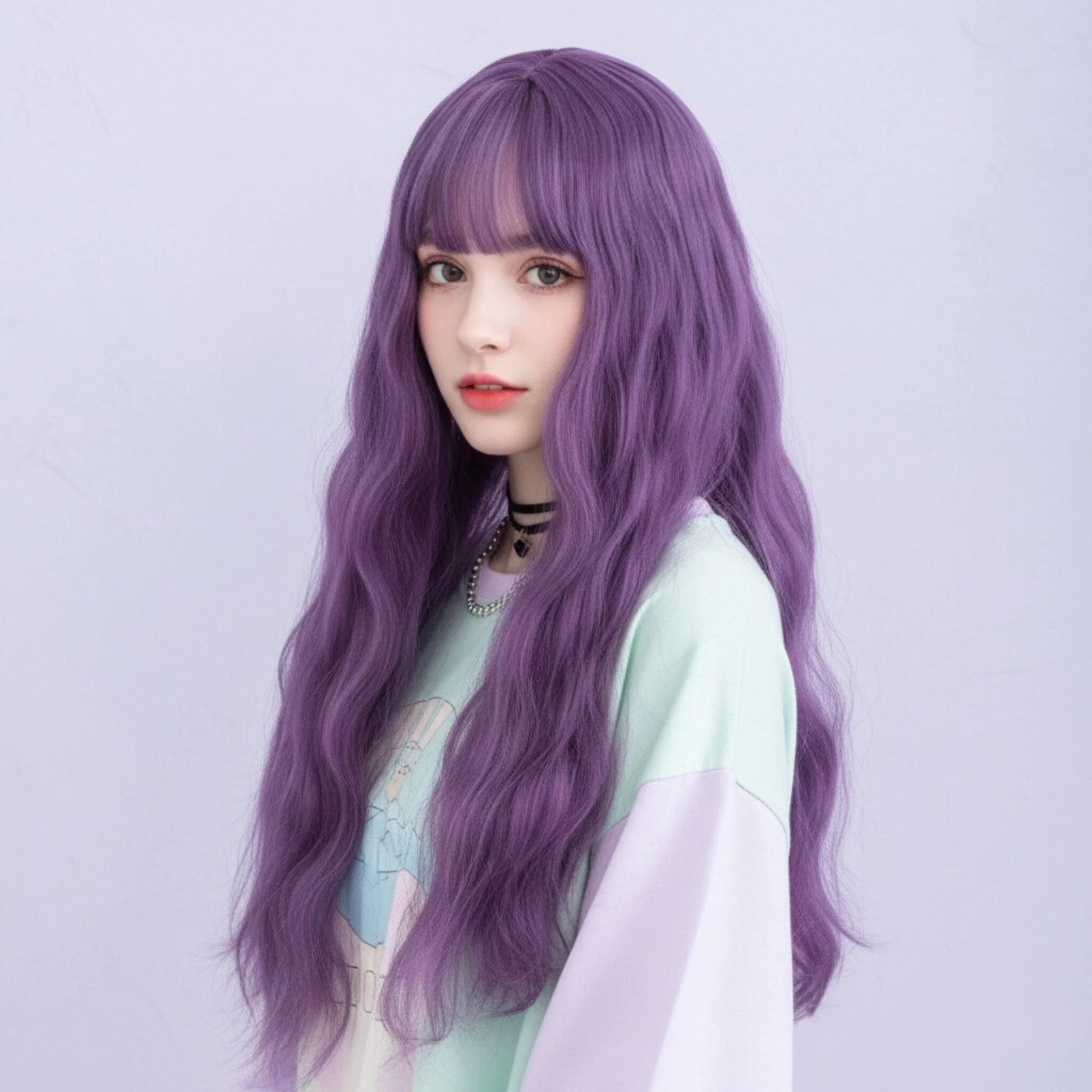 Long Wavy Synthetic Wig Deep Purple with Bangs Perfect for Daily Wear Cosplay Party Looks Fashion Fake Hair